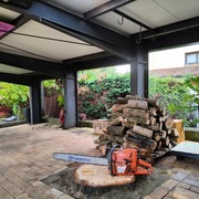 Quisiera levantar la traviesa (viga) más larga que se ve en la foto, retirar los bloques que delimitan el césped y poner la viga en su lugar. También habrá que recortar la otra viga que se ve en la foto para que quede marcando la esquina del césped con la que se ponga en lugar de los bloques